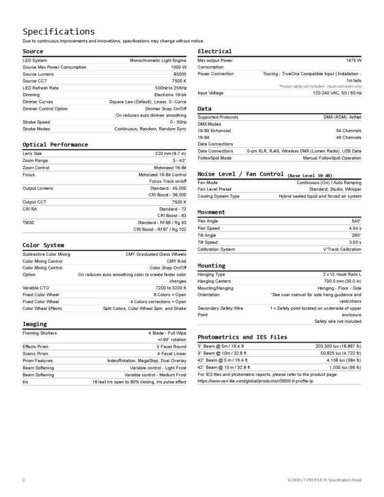 Oferece zoom de 3° a 42°, permitindo ajustes precisos para iluminação principal a grandes distâncias. - Lente frontal de 220 mm e compatibilidade total com o VL3600 Profile IP